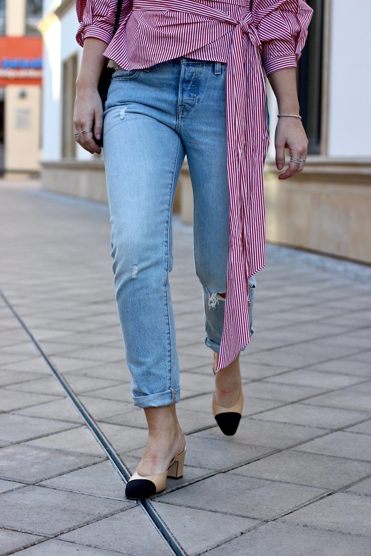 Darf es natürlich schicker sein. Ich trage nicht oft Absatz, aber wenn sich ein Anlass bietet, greife ich gern danach. Allerdings sind die High Heels aus meiner Party-Zeit längst eingestaubt. 10 bis 15 Zentimeter sind einfach viel zu unbequem und ehrlich gesagt, mag ich diese nicht mehr wirklich. Deshalb wähle ich mittlerweile lieber flachere Heels, am liebsten mit Blocksatz. Ich kann mich gut bewegen und halte auch den ganzen Abend ohne schmerzende Füße durch. Meiner Meinung nach gibt es nichts schlimmeres als in den Schuhen nicht mehr anständig gehen zu können. In meinem Look habe ich mich für meine Chanel Slingbacks entschieden. Sie sind total bequem und passen zudem perfekt zu Jeans. Mein schlichtes Outfit vom Tag wird damit aufgewertet, sieht aber trotzdem nicht übertrieben aus. Die Bluse die trage hat als Besonderheit ein Wickel-Detail. Tagsüber habe ich die Schleife nach hinten gebunden, das wirkt schlicht und unauffällig. Am Abend darf es da aber ruhig etwas mehr sein – hierfür habe ich die Bluse vorn gebunden.